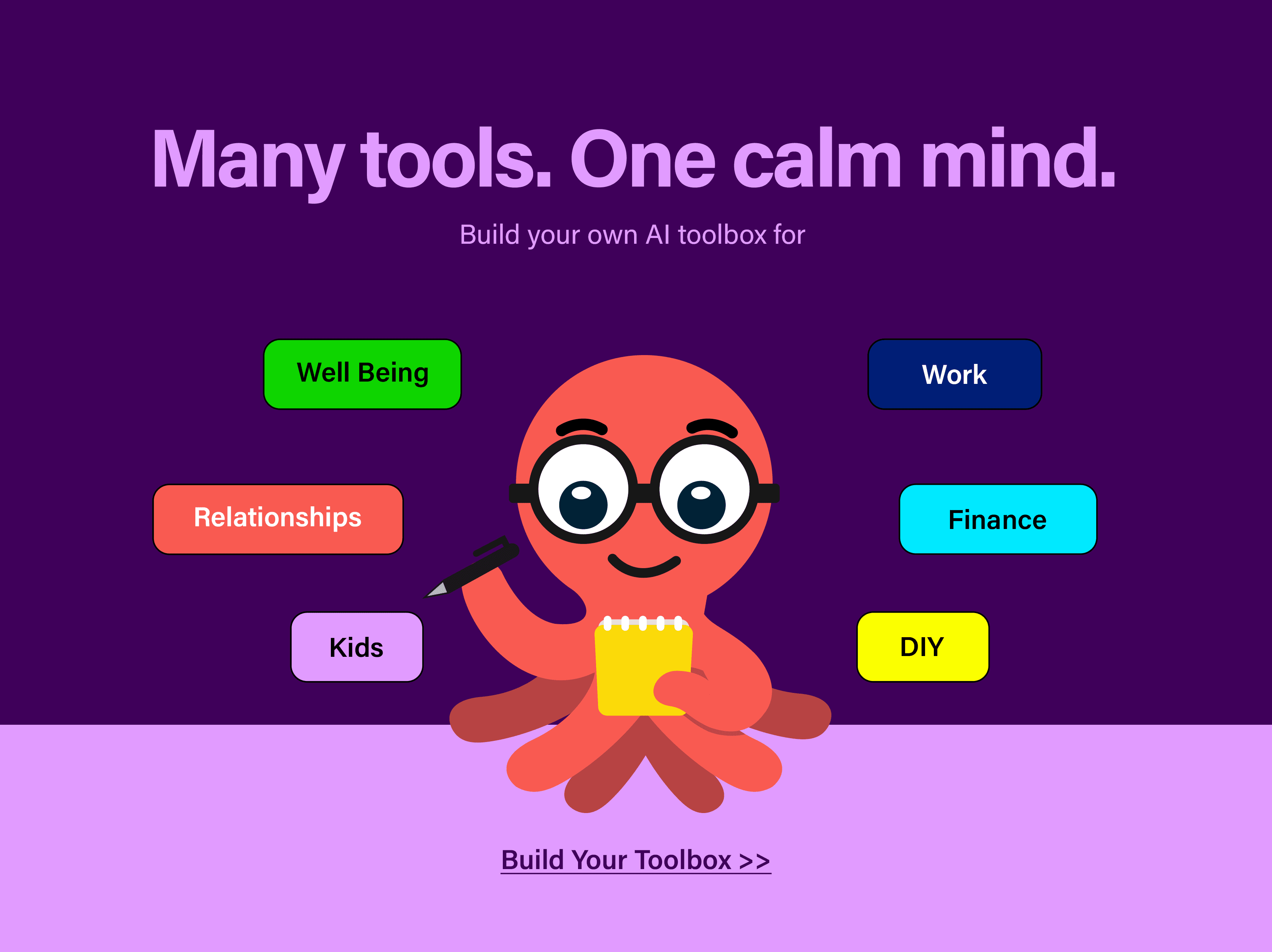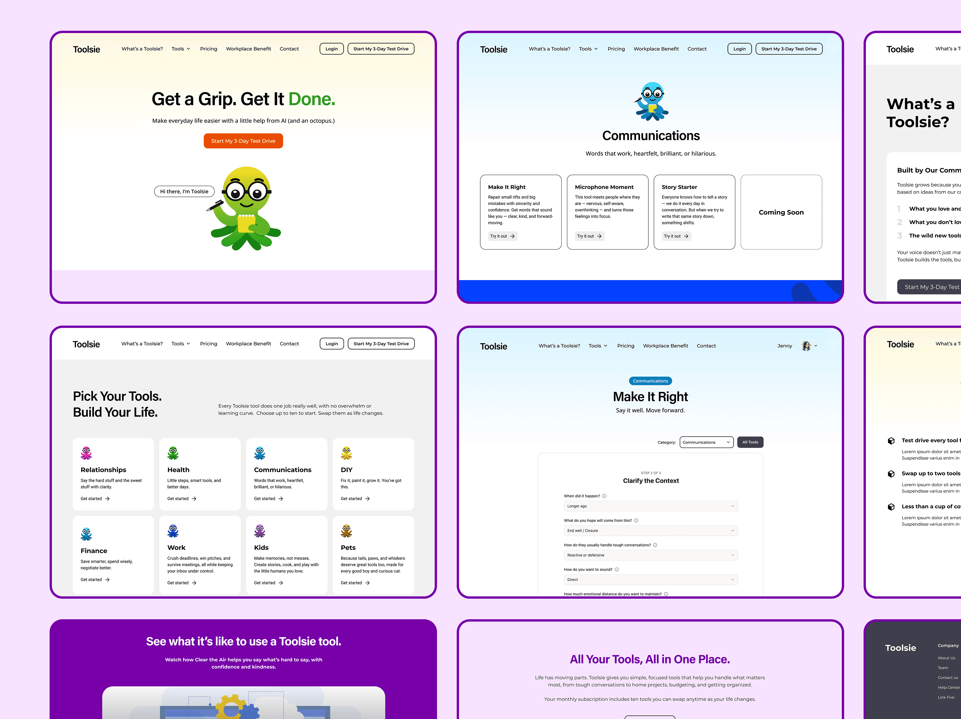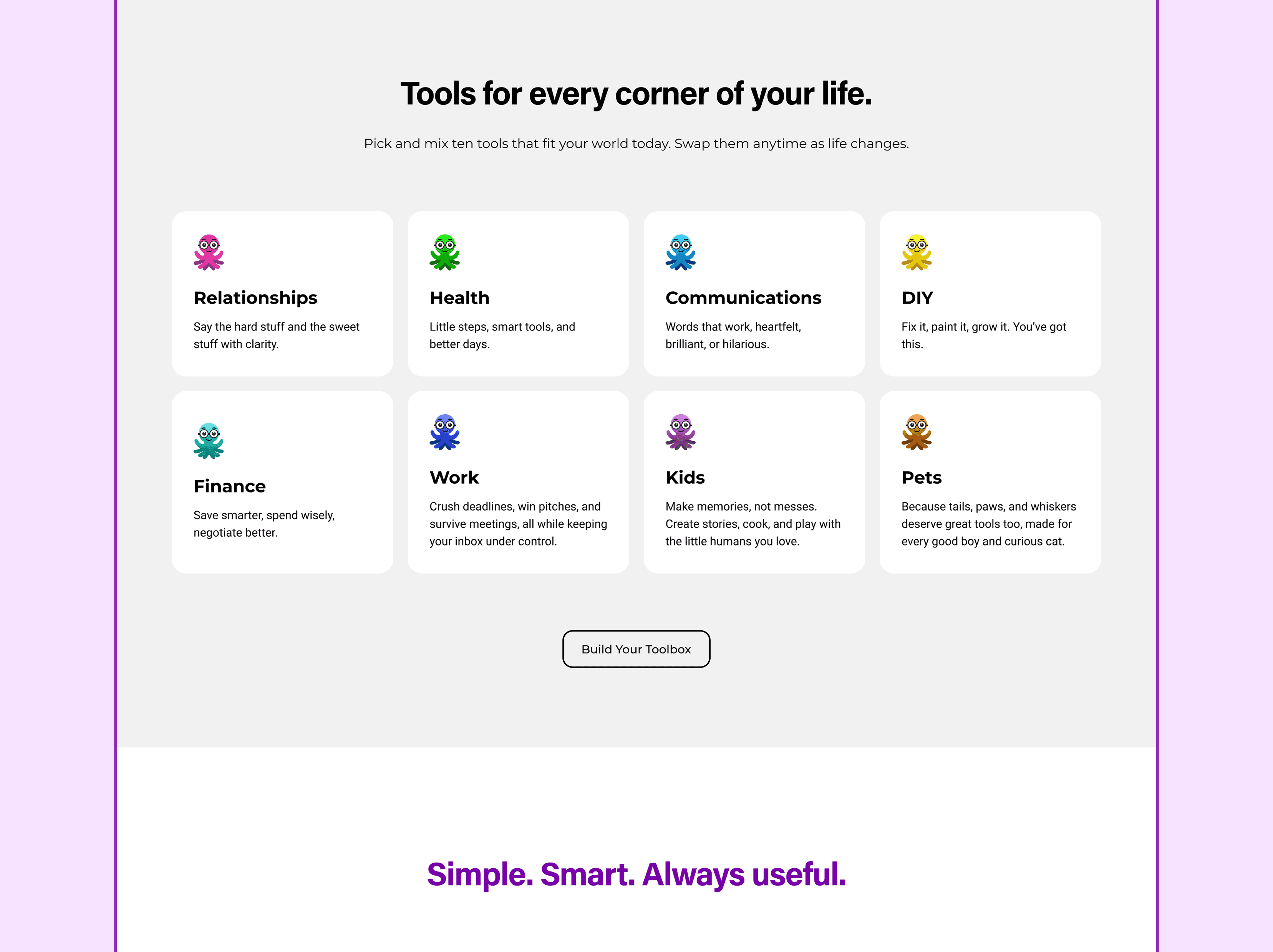 I developed a personality-led identity centered on a multi-expressive octopus mascot that serves as a responsive, empathetic face for the technology. Moving away from sterile tech aesthetics, I utilized a vibrant palette—including bold purples, electric greens, and deep blues—to inject energy into the brand. This visual system was integrated into a "Toolbox" web architecture where I structured AI utilities into practical, everyday categories like "Money" and "DIY". This combination of a playful mascot and a highly organized UI successfully reframed Toolsie as an essential, accessible utility, proving that personality-driven design can significantly enhance the accessibility and perceived value of a complex AI product.