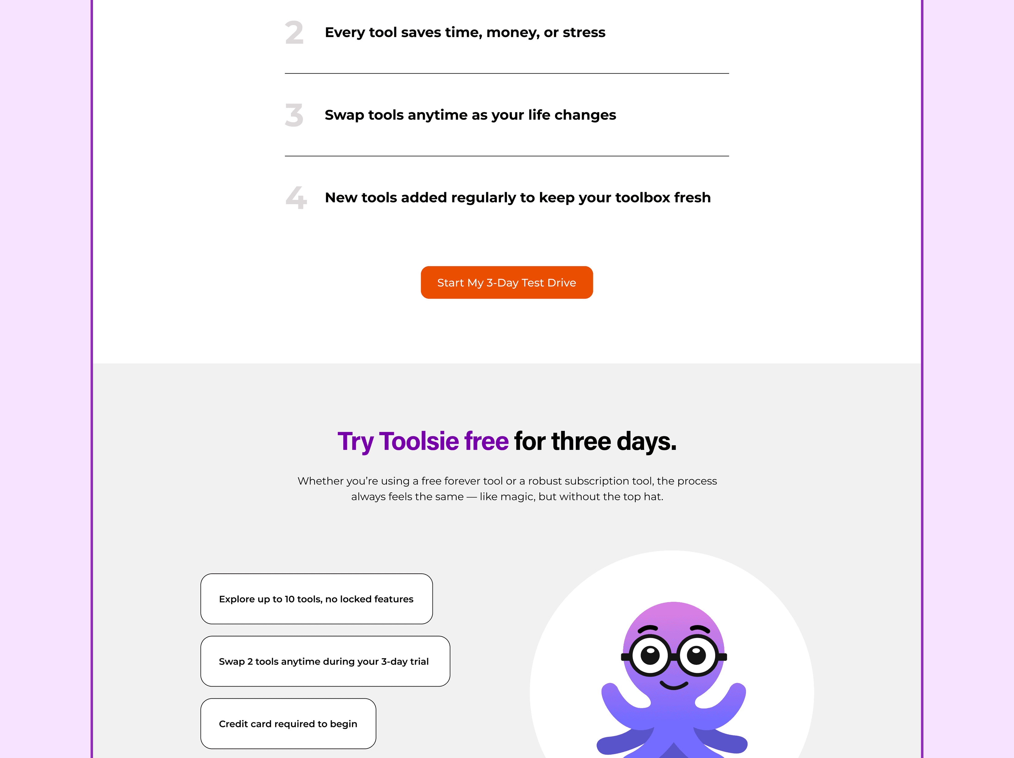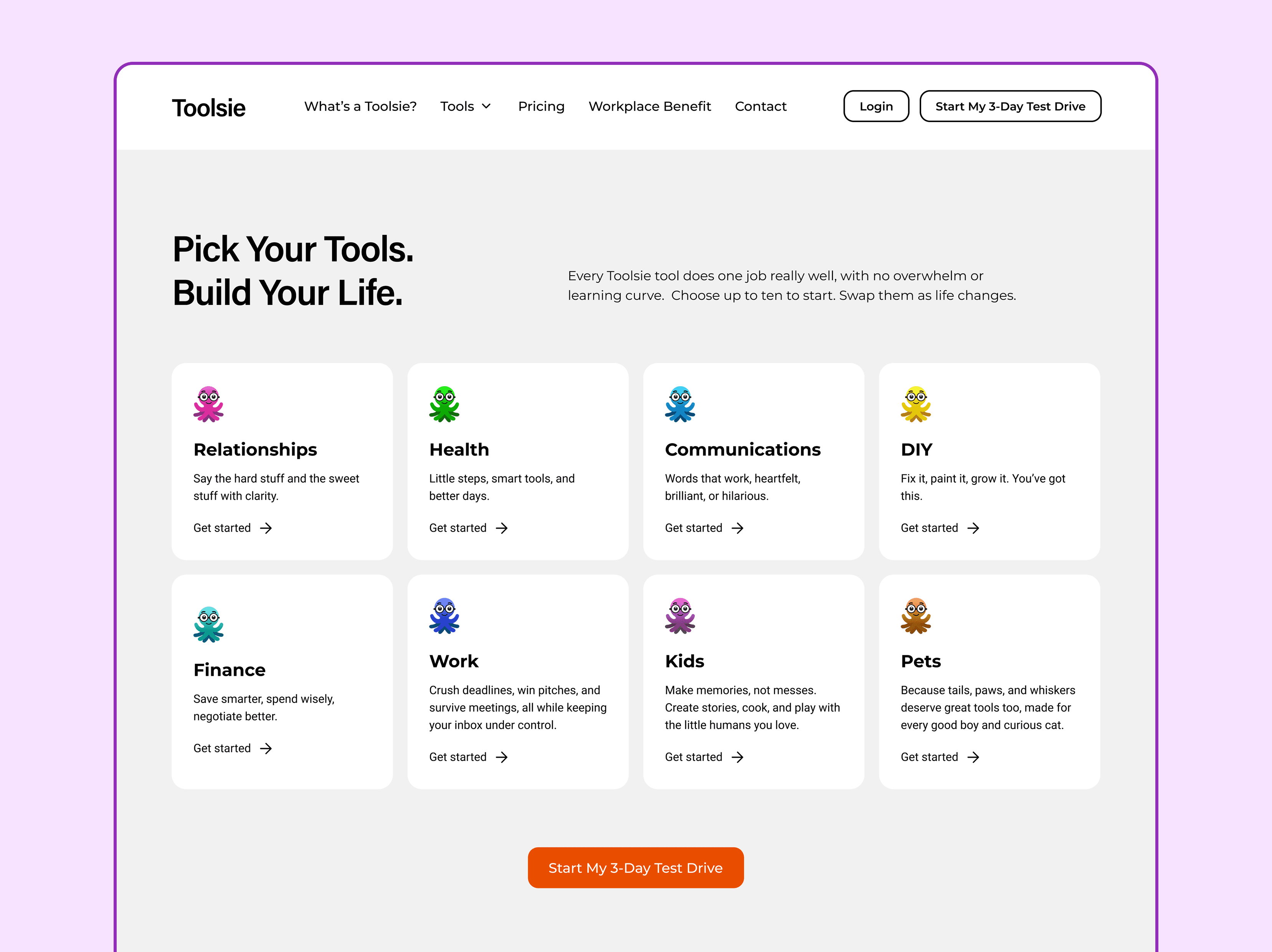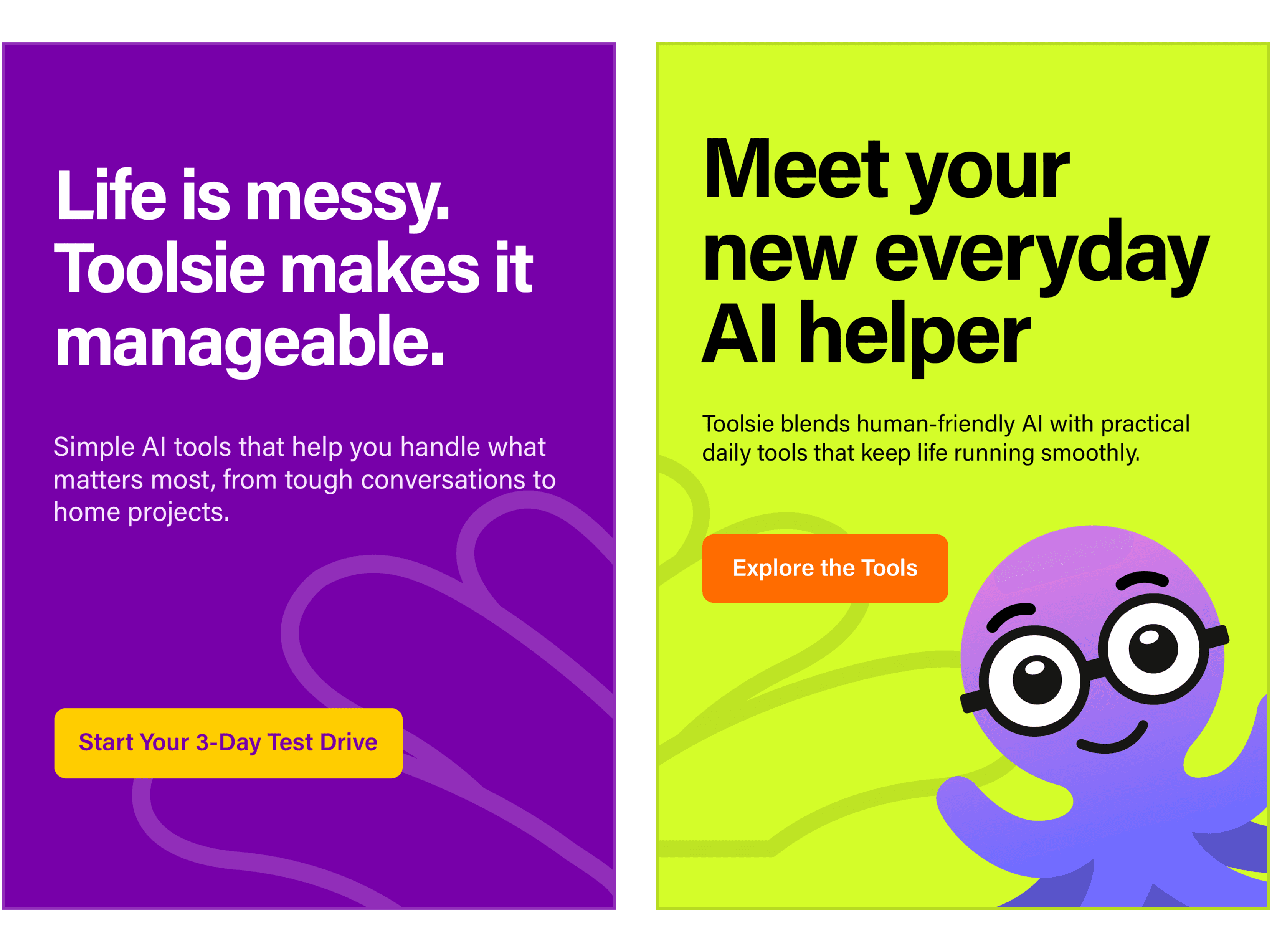 I developed a personality-led identity centered on a multi-expressive octopus mascot that serves as a responsive, empathetic face for the technology. Moving away from sterile tech aesthetics, I utilized a vibrant palette—including bold purples, electric greens, and deep blues—to inject energy into the brand. This visual system was integrated into a "Toolbox" web architecture where I structured AI utilities into practical, everyday categories like "Money" and "DIY". This combination of a playful mascot and a highly organized UI successfully reframed Toolsie as an essential, accessible utility, proving that personality-driven design can significantly enhance the accessibility and perceived value of a complex AI product.